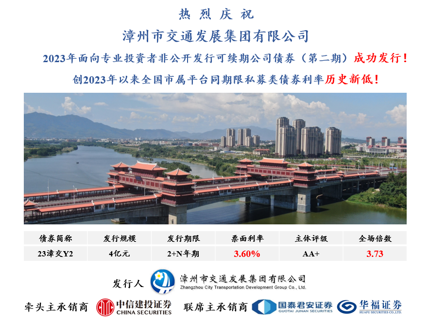 漳州交通集團(tuán)此次發(fā)行創(chuàng)下了2023年全國市屬平臺(tái)同期限(2+N)私募類債券利率的歷史新低,體現(xiàn)了集團(tuán)在債券市場(chǎng)上的強(qiáng)大影響力,也進(jìn)一步證明市場(chǎng)對(duì)漳州交通集團(tuán)穩(wěn)健經(jīng)營(yíng)和良好前景的高度認(rèn)可。