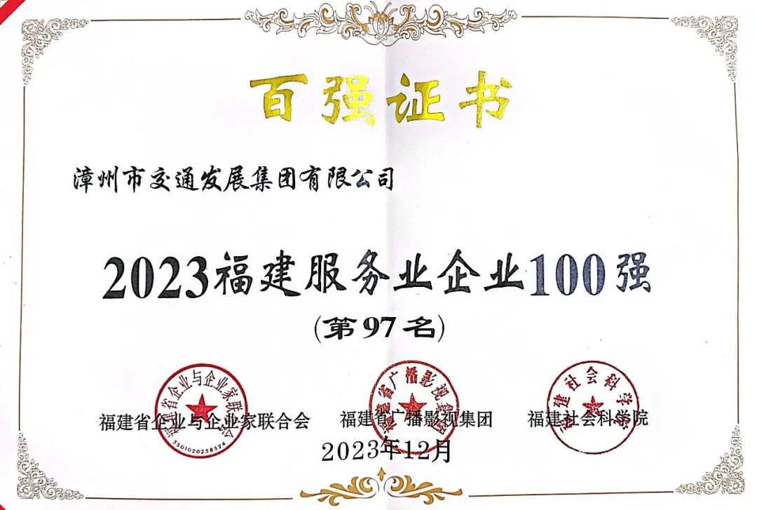 12月19日下午,2023福建企業(yè)100強發(fā)布大會在三明召開,漳州交通集團榮登2023福建服務業(yè)企業(yè)100強。