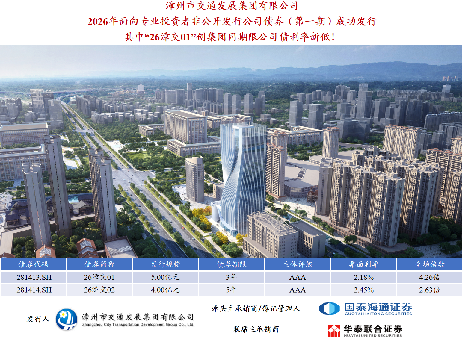 本期債券為雙品種債券,其中26漳交01發行期限3年期,發行規模5億元,票面利率2.18%,全場倍數4.26倍;26漳交02發行期限5年期,發行規模4億元,票面利率2.45%,全場倍數2.63倍。本期債券由牽頭主承銷商國泰海通證券和聯席主承銷商華泰聯合證券共同承銷,其中26漳交01創下集團同期限公司債利率新低!